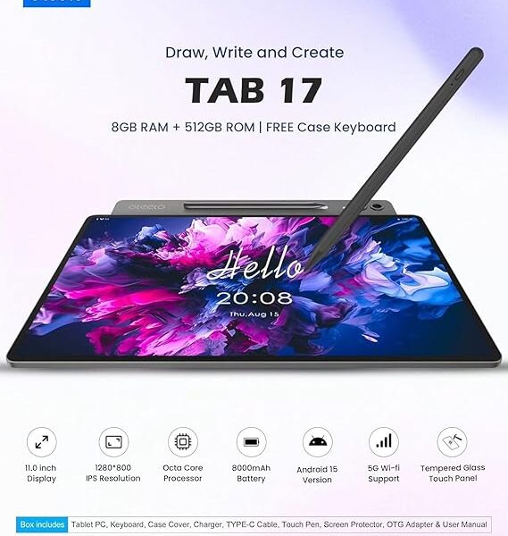 Oteeto TAB 17 Android Tablet, 11-inch Display, 8GB RAM, 512GB Storage, 8000mAh Battery, 5G Wi-Fi, with Keyboard Case & Stylus