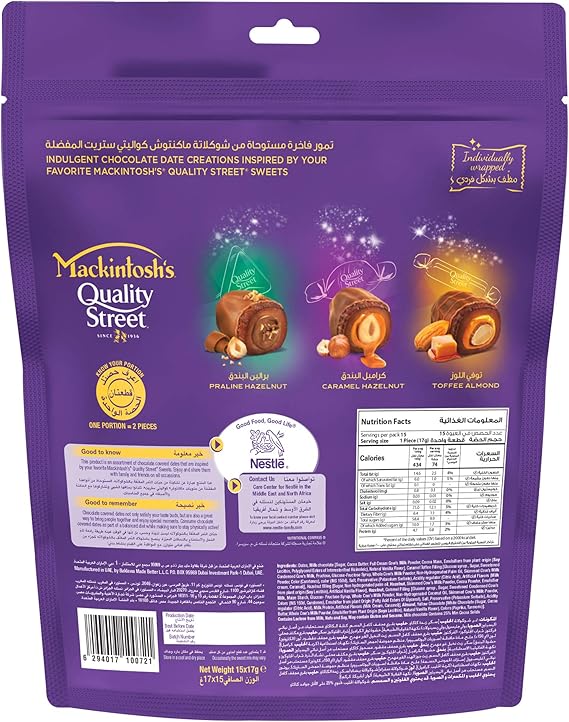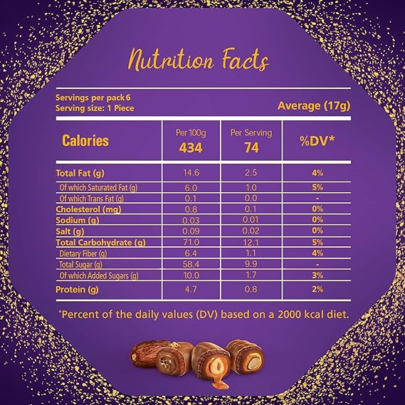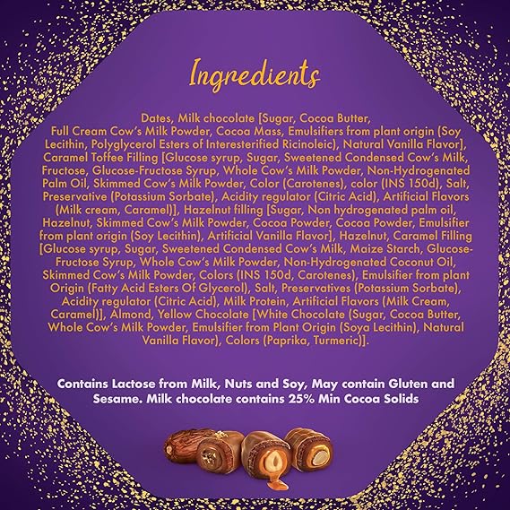 “Ingredients: Dates, Milk chocolate [Sugar, Cocoa Butter, Full Cream Cow’s Milk Powder, Cocoa Mass, Emulsifiers from plant origin (Soy Lecithin, Polyglycerol Esters of Interesterified Ricinoleic), Natural Vanilla Flavor], Caramel Toffee Filling [Glucose syrup , Sugar, Sweetened Condensed Cow’s Milk, Fructose, Glucose-Fructose Syrup, Whole Cow’s Milk Powder, Non-Hydrogenated Palm Oil, Skimmed Cow’s Milk Powder, Color (Carotenes), color (INS 150d), Salt, Preservative (Potassium Sorbate), Acidity regulator (Citric Acid), Artificial Flavors (Milk cream, Caramel(], Hazelnut filling [Sugar, Non hydrogenated palm oil, Hazelnut, Skimmed Cow’s Milk Powder, Cocoa Powder, Emulsifier from plant origin (Soy Lecithin), Artificial Vanilla Flavor], Hazelnut, Caramel Filling [Glucose syrup , Sugar, Sweetened Condensed Cow’s Milk, Maize Starch, Glucose- Fructose Syrup, Whole Cow’s Milk Powder, Non-Hydrogenated Coconut Oil, Skimmed Cow’s Milk Powder, Colors (INS 150d, Carotenes), Emulsifier from plant Origin (Fatty Acid Esters Of Glycerol), Salt, Preservative (Potassium Sorbate), Acidity regulator (Citric Acid), Milk Protein, Artificial Flavors (Milk Cream, Caramel)], Almond, Yellow Chocolate [White Chocolate (Sugar, Cocoa Butter, Whole Cow’s Milk Powder, Emulsifier from Plant Origin (Soya Lecithin), Natural Vanilla Flavor), Colors (Paprika, Turmeric)]. Contains Lactose from Milk, Nuts and Soy, May contain Gluten and Sesame. Milk chocolate Contains 25% Min Cocoa Solids”